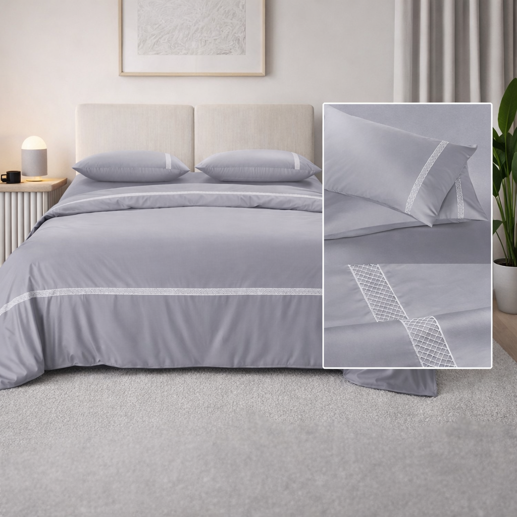 The subtle mist grey tone paired with delicate geometric lace detailing adds a modern yet sophisticated touch to your space. With a rich 550 thread count, it ensures a silky feel and premium hotel-like comfort for everyday use.